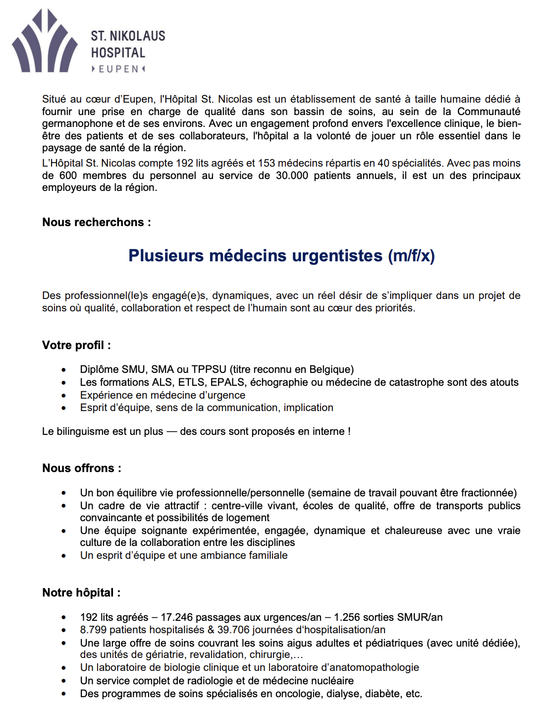 | Intéressé de nous rejoindre ? Alors, n'hésitez pas à nous faire parvenir votre candidature à direktion@hospitaleupen.be. |
