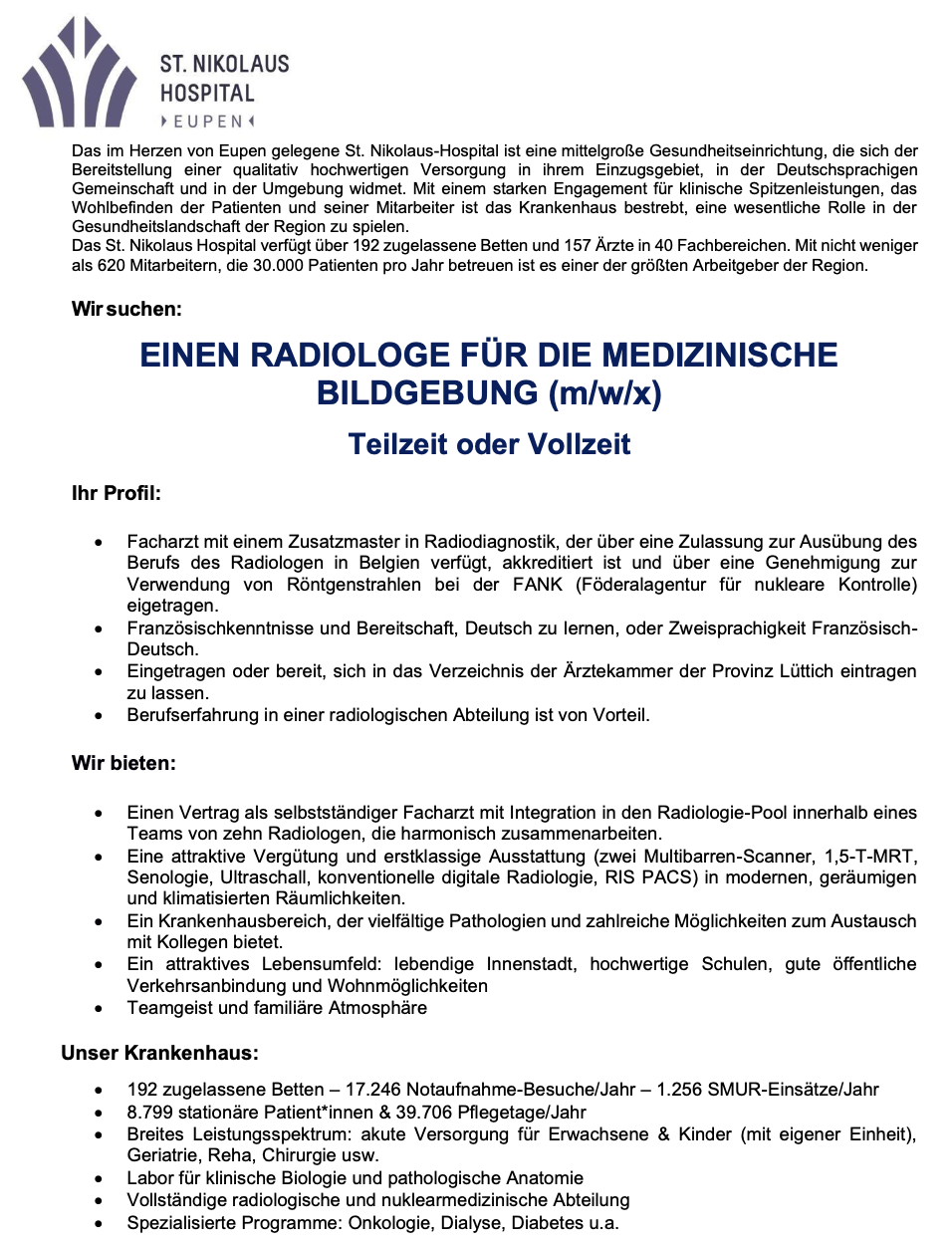 | Interesse, Teil unseres Teams zu werden? Dann senden Sie uns Ihre Bewerbung zusammen mit einem ausführlichen Lebenslauf. Kontact Herr Dr Michaël Heinen, ÄDL der Radiologie michael.heinen@hospital-eupen.be – +32 87 599.640 St. Nikolaus-Hospital, Hufengasse 4-8, 4700 Eupen |