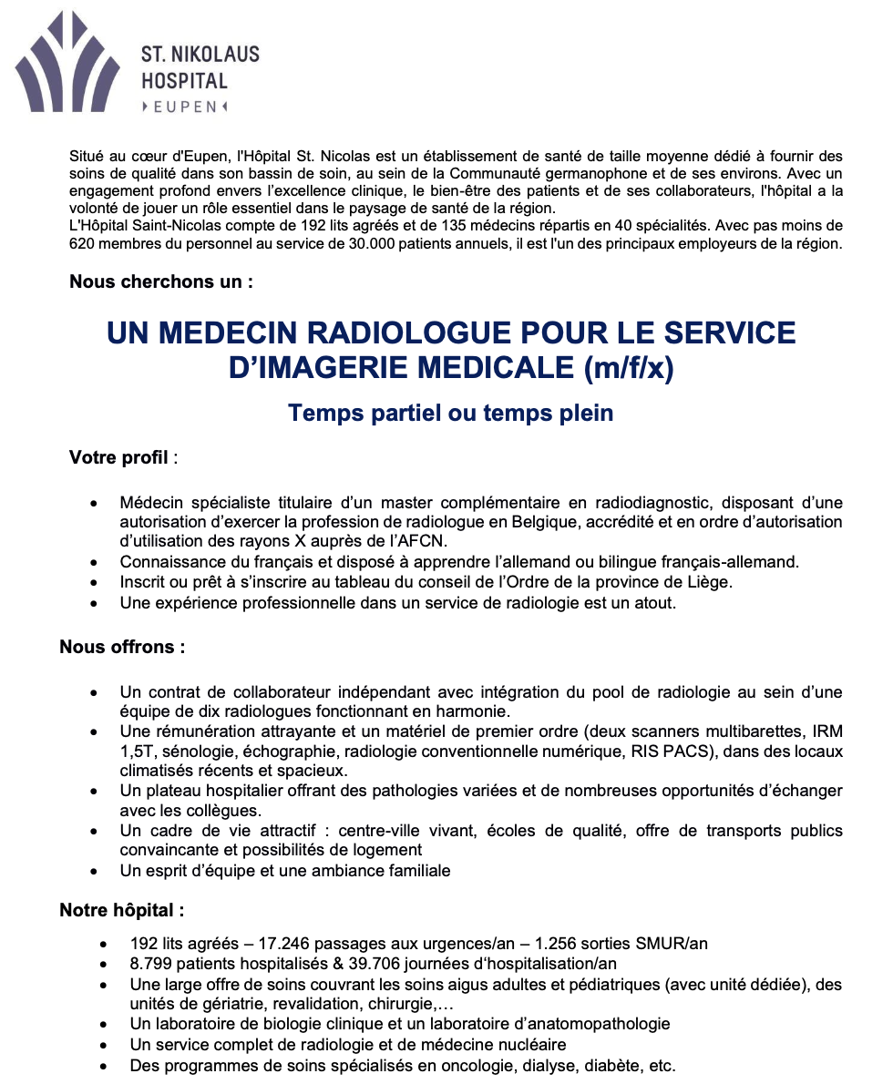 | Intéressé(e) de rejoindre notre équipe ? Faites-nous parvenir votre candidature accompagnée d’un CV détaillé. Contact Monsieur le Docteur Michaël Heinen, Médecin-chef du service d’imagerie médicale michael.heinen@hospital-eupen.be – +32 87 599.640 St. Nikolaus-Hospital, Hufengasse 4-8, 4700 Eupen |